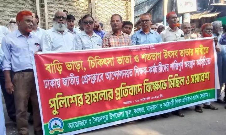 ঢাকায় শান্তিপূর্ণ কর্মসূচিতে পুলিশের হামলার প্রতিবাদে ও তিন দফা দাবি বাস্তবায়নের দাবিতে সৈয়দপুরে সড়ক অবরোধ করে বিক্ষোভ সমাবেশ করেছেন আন্দোলনরত শিক্ষকরা। সোমবার (১৩ অক্টোবর) বিকেল ৩টায় সৈয়দপুর প্রেস ক্লাবের সামনে ‘সৈয়দপুর উপজেলা স্কুল, কলেজ, মাদ্রাসা ও কারিগরি শিক্ষাপ্রতিষ্ঠান প্রধান ফোরাম’-এর ব্যানারে এ সমাবেশ অনুষ্ঠিত হয়। এর আগে বিক্ষুব্ধ শিক্ষকরা শহরের প্রধান প্রধান সড়কে মিছিল বের করে বিভিন্ন স্লোগান দেন। পরে মিছিলটি প্রেস ক্লাবের সামনে এসে সমাবেশে মিলিত হয়।