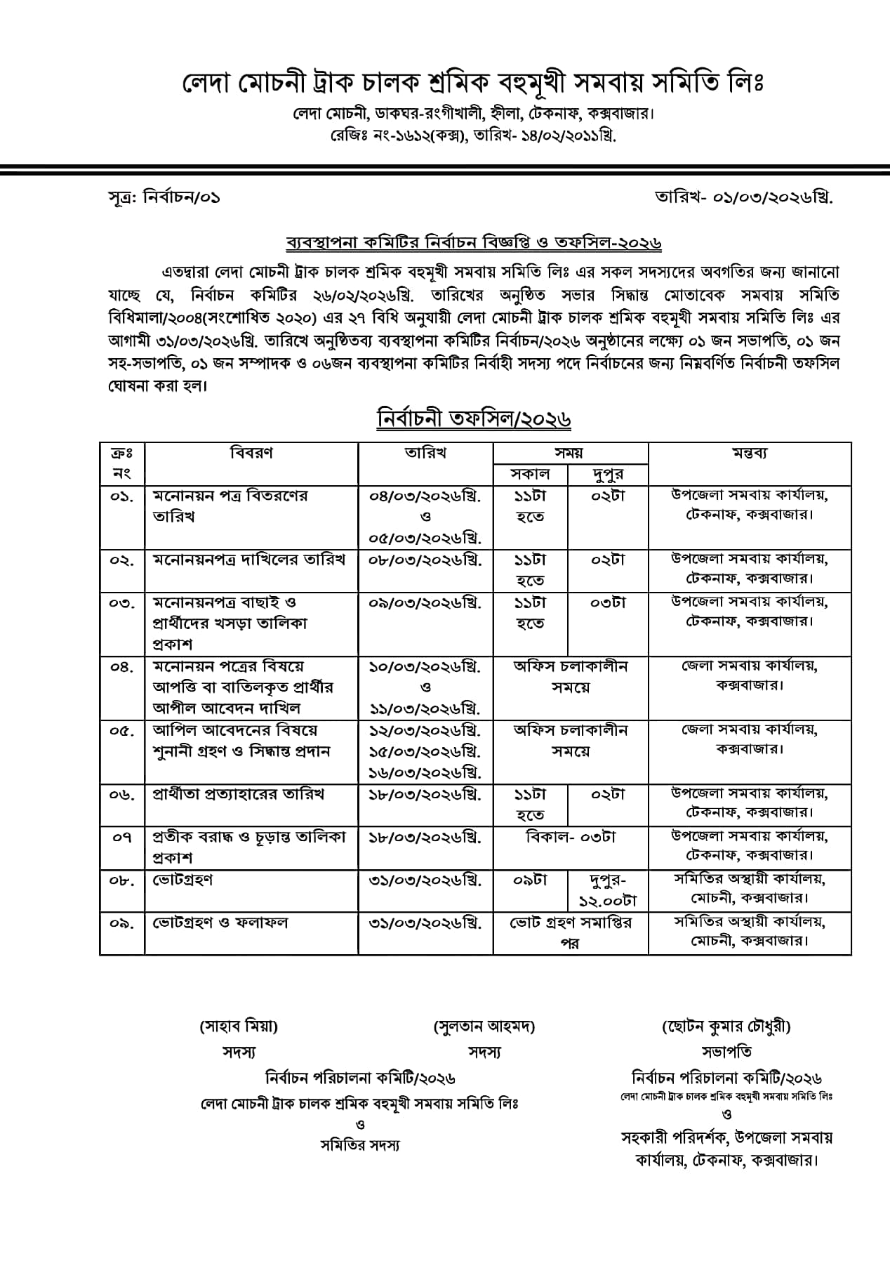 টেকনাফ উপজেলার হ্নীলা ইউনিয়নের অন্তর্গত লেদা মোচনী ট্রাক চালক শ্রমিক বহুমুখী সমবায় সমিতি লিমিটেড-এর ব্যবস্থাপনা কমিটির নির্বাচন-২০২৬ উপলক্ষে আনুষ্ঠানিকভাবে নির্বাচন বিজ্ঞপ্তি ও তফসিল ঘোষণা করা হয়েছে।